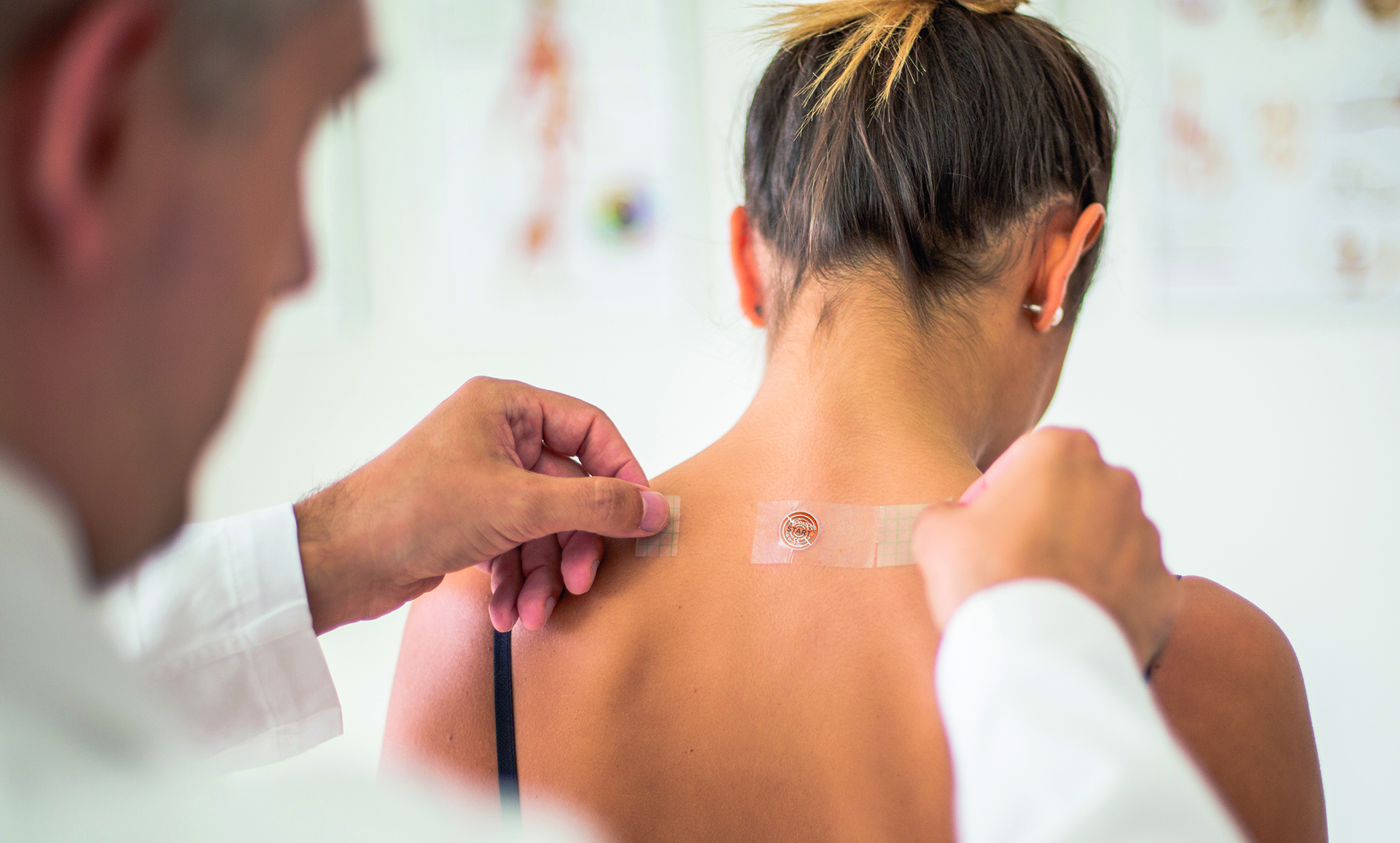 > massima efficacia tramite una semplice applicazione, che viene effettuata esclusivamente da figure professionali sanitarie formate che posizionano il dispositivo su punti specifici della cute utilizzando un cerotto ipoallergenico;